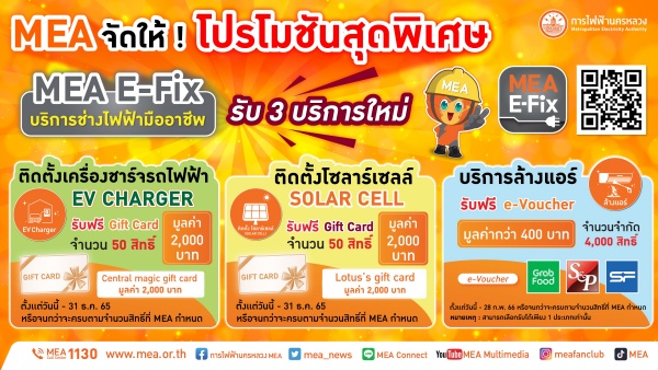 (ตั้งแต่วันนี้ – 31 ธ.ค. 65 หรือจนกว่าจะครบตามจำนวนสิทธิ์ที่ MEA กำหนด)