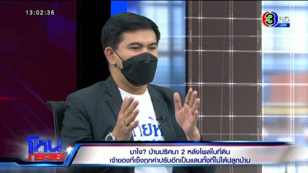 เอก : ตอนผู้เสียหายมาร้องที่สายไหมต้องรอด เขาก็อธิบายพูดคุย แต่ผู้เสียหายเข้าใจว่าโครงการหมู่บ้านจัดสรร ทราบว่าที่ตรงนี้ไม่ใช่ที่เขา แต่เป็นแปลงสวย เป็นแปลงทำเลดี เลยไปสร้างก่อน แล้วเหมือนเข้าใจว่าสร้างเสร็จแล้วค่อยมาคุยกับเจ้าของที่ทีหลัง ว่าสร้างไปแล้ว เลยมาขอซื้อที่ แต่ตัวผมเองได้อธิบายว่าต้องคุยกัน ต้องเจรจากัน แต่ข้อสงสัยของพี่เจ้าของที่ดิน เหมือนเราจะปลูกบ้านหลังนึง เราต้องไปติดต่อที่เทศบาลก่อนเอาโฉนดที่ดินให้เทศบาลดูว่าจะปลูกสร้างที่ดินบนโฉนดแปลงนี้ เจ้าของที่ต้องอนุญาต เทศบาลต้องขอดูโฉนด ขอดูแบบทุกอย่าง เทศบาลต้องดูแบบ แก้แบบถึงเซ็น พอเซ็นเสร็จถึงเอาแบบไปให้ผู้รับเหมาแล้วก่อสร้าง ฉะนั้นการไปก่อสร้างโดยไม่มีแบบ โดยที่แบบยังไม่ออก มันทำไม่ได้เด็ดขาด ผมถึงสงสัย เพราะฝั่งเจ้าของที่ดินเขาก็สงสัยว่าแล้วไปก่อสร้างยังไง ในเมื่อไม่ได้ไปขออนุญาตก่อน กลายเป็นเขาต้องมาเดือดร้อน โดยเทศบาลไปแจ้งเขาว่าคุณปลูกบ้านโดยไม่ได้ขออนุญาต ต้องจ่าย 6 หมื่น แล้วเทศบาลทราบเรื่องนี้มา 5 เดือนแล้ว มีการยกเลิกหรือยัง คำตอบคือยังนะครับ เทศบาลก็ยังยืนยันว่าต้องไปเสียค่าปรับ และเสียเป็นรายวันอีกต่างหาก จนถึงขณะนี้ก็ยังไม่มีการบอกเลิก