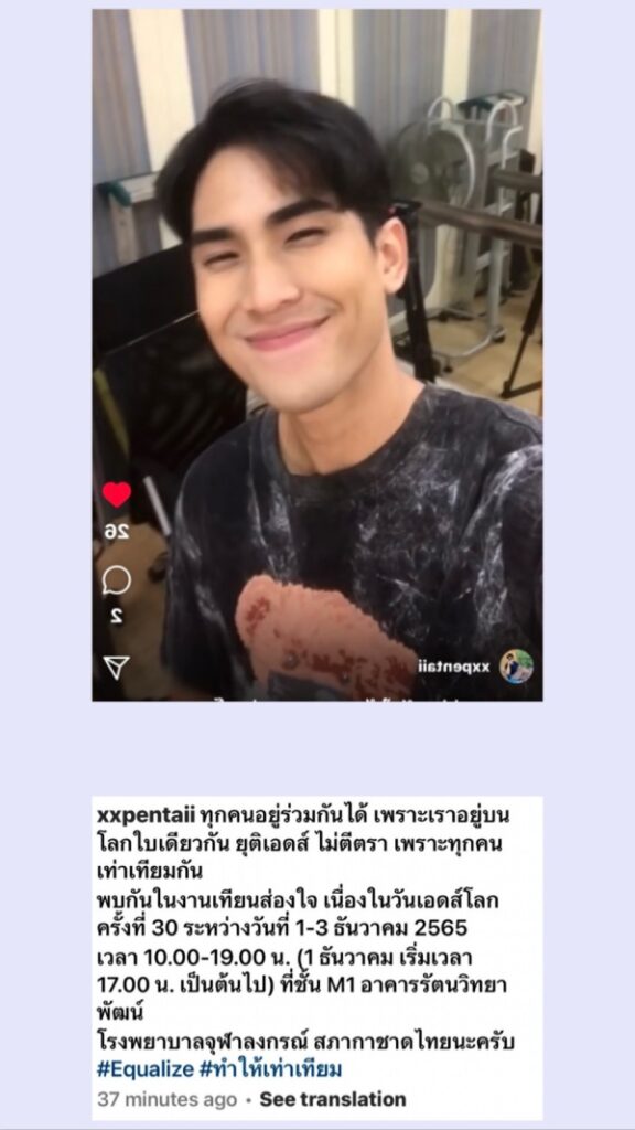 นักแสดงของช่อง 3 “กองทัพ พีค” และ ออกัส “วชิรวิชญ์ ไพศาลสกุลวงศ์” ร่วมเป็นพรีเซ็นเตอร์ใน งาน “เทียนส่องใจ” เนื่องในวันเอดส์โลก โดยมีสองหนุ่ม จ๊อบ “ธัชพล กู้วงศ์บัณฑิต” และ เป็นไต๋ “ณัฐนิช ประดิษฐาน” มาร่วมด้วยช่วยกันผ่านโซเชี่ยลมีเดียของตัวเอง เพื่อร่วมรณรงค์ให้เกิดความตระหนักถึงปัญหาของโรคเอดส์ พร้อมวิธีการป้องกัน โดยมี ธีมงานปีนี้คือ #Equalize# ทำให้เท่าเทียม