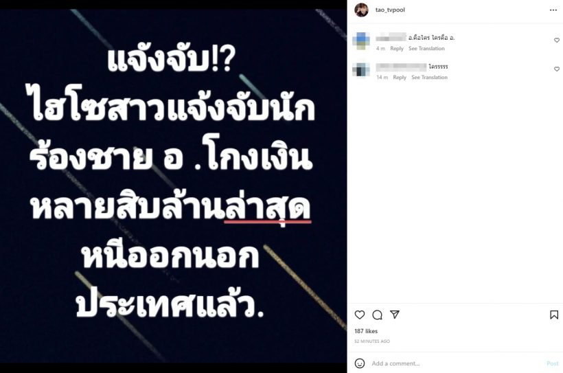 “เต๋า ทีวีพูล”พิธีกรรายการข่าวบันเทิงชื่อดัง โพสต์ถึงประเด็นเม้าท์มาแรงและเป็นเรื่องใหญ่มากในโซเชียล เผยว่า “แจ้งจับ!? ไฮโซสาวแจ้งจับนักร้องชาย อ. โกงเงินหลายสิบล้าน ล่าสุดหนีออกนอกประเทศแล้ว.”
