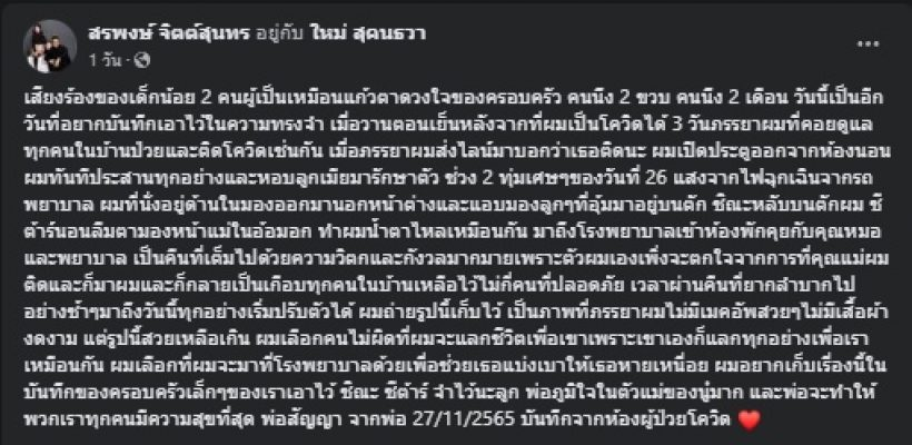 ล่าสุด สาวใหม่ – ดีเจต้น โพสต์เฟสบุ๊ก แจ้งข่าวว่าติดโควิด-19 ยกครอบครัว ทำเอาแฟน ๆ ส่งกำลังใจไปให้กันอย่างรัว ๆ