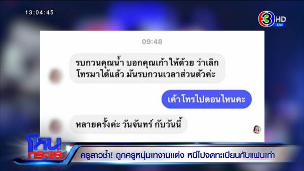 ครูน้ำ : ผู้หญิงคนเดิมทักเฟซบุ๊กมาบอกว่ารบกวนครูน้ำบอกครูเก้าให้เลิกโทรมาได้แล้วนะคะ มันเสียเวลาส่วนตัว น้ำก็ขอดูหลักฐาน เขาก็แคปมาให้ดู ผู้หญิงก็โทรมาบอกว่าโทรมาปรึกษา รู้สึกอยากกลับไป ไม่มีความสุขในชีวิตเลย คุยปรึกษาเรื่องการเงิน และฝากบอกเขาด้วยว่าไม่ต้องโทรมาแล้ว เขามีแฟนใหม่แล้ว ไม่เอาแล้วค่ะ ผู้หญิงพูดว่ามีใหม่แล้วค่ะ ไม่เอาครูเก้าแล้วเหมือนกันค่ะ แล้วเขาก็ตัดสายไป