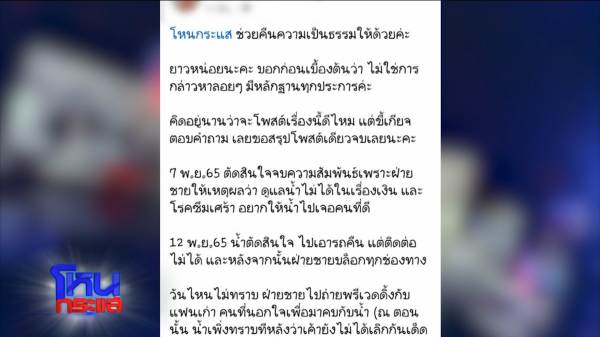 กรณีครูสาวออกมาเรียกร้องขอความเป็นธรรม หลังวางแผนเตรียมงานวิวาห์ แต่สุดท้ายฝ่ายชายขอจบ อ้างเรื่องโรคซึมเศร้า สองอาทิตย์ต่อมากลับไปจดทะเบียนกับแฟนเก่า เรียกค่าเสียหายแค่ 4 หมื่น แต่ฝ่ายชายไม่ยอมจ่าย อีกทั้งยังโพสต์ให้ร้าย ทำให้ได้รับความเสื่อมเสียชื่อเสียง