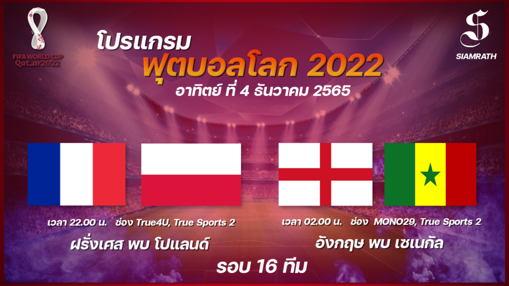 | 4 ธันวาคม 2565 | อังกฤษ – เซเนกัล | 2.00 น. | MONO29, True Sports 2 |