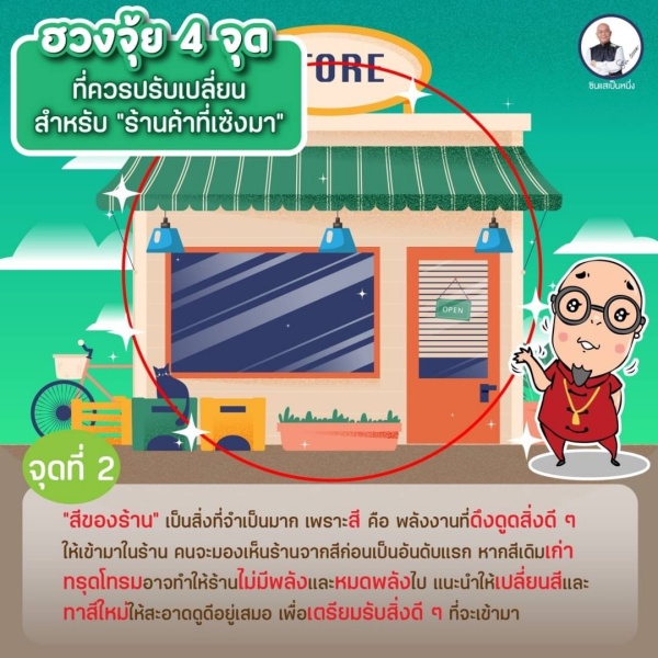 จุดที่ 2 “สีของร้าน” เป็นสิ่งที่จำเป็นมาก เพราะสี คือพลังงานที่ดึงดูดสิ่งดี ๆ ให้เข้ามาในร้าน คนจะมองเห็นร้านจากสีก่อนเป็นอันดับแรก หากสีเดิมเก่าทรุดโทรมอาจทำให้ร้านไม่มีพลังและหมดพลังไป แนะนำให้เปลี่ยนสีและทาสีใหม่ให้สะอาดดูดีอยู่เสมอ เพื่อเตรียมรับสิ่งดี ๆ ที่จะเข้ามา