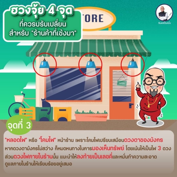 จุดที่ 3 “หลอดไฟ” หรือ “โคมไฟ” หน้าร้าน เพราะโคมไฟเปรียบเสมือนดวงตาของมังกร หากดวงตามังกรไม่สว่าง ก็หมดหนทางในการมองเห็นทรัพย์ ดังนั้นควรจะเปลี่ยนไฟหน้าร้านใหม่ให้ส่องสว่าง โดยเน้นให้เป็น 3 ดวง ส่วนดวงไฟภายในร้านนั้น แนะนำให้ลงท้ายเป็นเลขคี่และหมั่นทำความสะอาดดูแลภายในร้านให้เรียบร้อยอยู่เสมอ