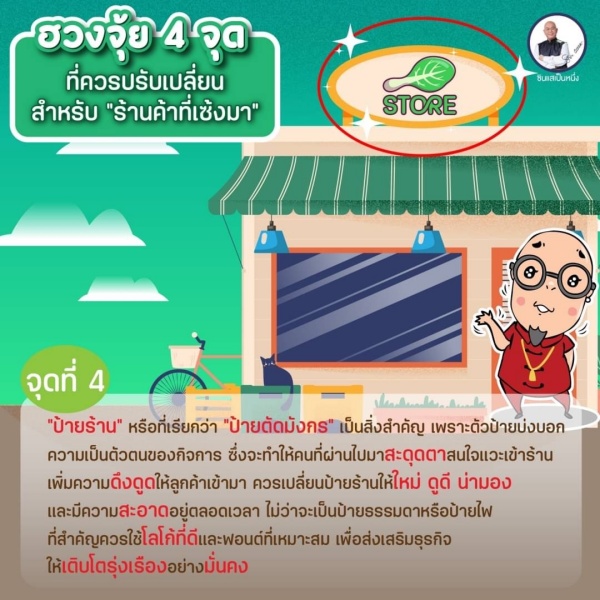 จุดที่ 4 “ป้ายร้าน” หรือที่เรียกว่า “ป้ายตัดมังกร” เป็นสิ่งสำคัญที่ขาดไม่ได้เช่นกัน เพราะตัวป้ายบ่งบอกถึงความเป็นตัวตนของกิจการได้ดีที่สุด ซึ่งจะทำให้คนที่ผ่านไปมาสะดุดตาสนใจแวะเข้าร้าน เพิ่มความดึงดูดให้ลูกค้าเข้ามา ควรเปลี่ยนป้ายร้านให้ใหม่ ดูดี น่ามอง และมีความสะอาดอยู่ตลอดเวลา ไม่ว่าจะเป็นป้ายธรรมดาหรือป้ายไฟ ที่สำคัญควรใช้โลโก้ที่ดีและฟอนต์ที่เหมาะสม เพื่อส่งเสริมธุรกิจให้เติบโตรุ่งเรืองอย่างมั่นคง