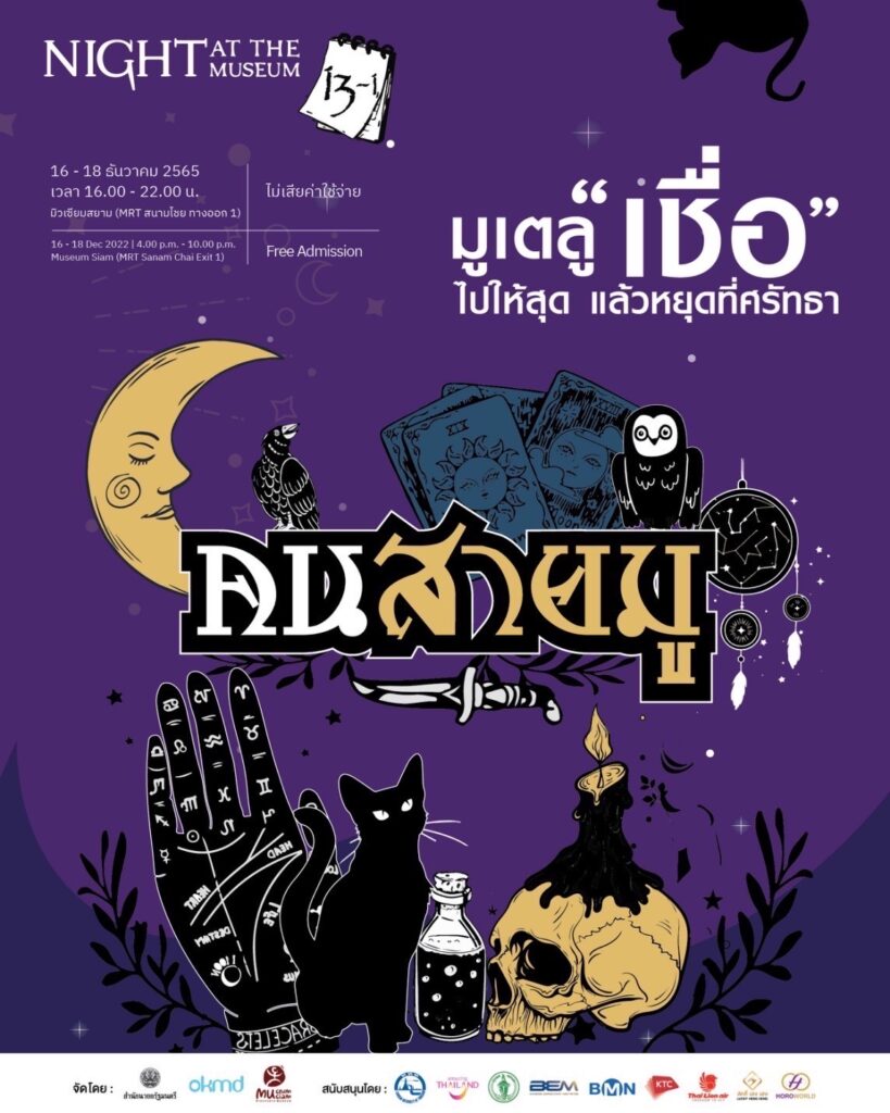 กลับมาอีกครั้ง…กับการจัดงานในบรรยากาศมิวเซียมสยามยามค่ำ Night at the Museum ครั้งที่ 12 คนสายมู ในธีม มูเตลู “เชื่อ” ไปให้สุดแล้วหยุดที่ศรัทธา เพราะคนไทยกับความเชื่อคือของคู่กันมาช้านาน เพราะอะไรจึงต้องเชื่อ? อำนาจเหนือธรรมชาติมีจริงหรือ? สิ่งยึดเหนี่ยวจิตใจกับเศรษฐกิจเกี่ยวกันยังไง? ถ้าอยากรู้แบบไม่ลบหลู่ ก็เตรียมตัวให้พร้อม มาเปิดประสบการณ์เรียนรู้แบบสับ สนุกเร้าใจ ไม่เหมือนใคร หนึ่งปีจะมีครั้งเดียวที่มิวเซียมสยาม มาร่วมเปิดประสบการณ์ไปกับปรากฏการณ์ความเชื่อในมิติร่วมสมัยที่นำพาชีวิต พลิกโชคชะตา พาให้ปัง เสริมพลังบารมี เพราะชีวิตนี้ขึ้นอยู่กับที่คุณจะเชื่อ!!! วันที่ 16-18 ธันวาคม 2565 เวลา 16.00-22.00 น. ณ มิวเซียมสยาม MRT สนามไชย(ทางออกที่1) กรุงเทพฯ (ไม่เสียค่าใช้จ่าย)