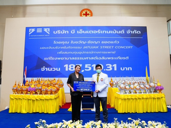 คุณฤมลชนก ดอกสายหยุด กรรมการผู้จัดการ (ตัวแทน) คุณ ใบขวัญ – รัชญา ยอดแก้ว ประธานกรรมการ บริษัท บีเอ็นเตอร์เทนเม้นต์ จำกัด มอบเงินบริจาคใน โครงการ “JATUJAK STREET CONCERT” จำนวน 187,510.31 บาท เพื่อสมทบทุนอุปกรณ์ทางการแทย์แก่โรงพยาบาลธรรมศาสตร์เฉลิมพระเกียรติ โดยมีผศ.นพ.ปรีดิ์ นิมมานนิตย์ ผู้ช่วยผู้อำนวยการฝ่ายวางแผนและงบประมาณ เป็นผู้รับมอบในครั้งนี้