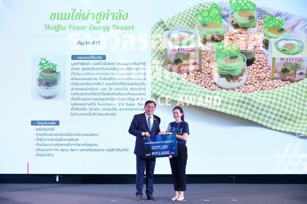 สำหรับรางวัลรองชนะเลิศอันดับที่ 1 คือ ทีม “M-FIT” ขนมไข่ผำชูกำลัง เป็นมูสเต้าหู้ไข่ผำสูตรไม่มีเจลาตินจากสัตว์ ต่อยอดภูมิปัญญาแหล่งอาหารอนาคตพืชนํ้าขนาดเล็กที่มีโภชนาการระดับซุปเปอร์ฟู๊ด