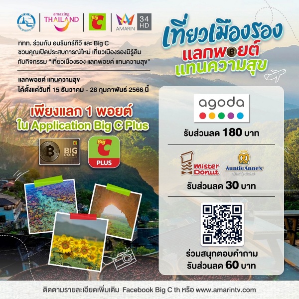ททท. ผนึกกำลัง บิ๊กซี ซูเปอร์เซ็นเตอร์ และอมรินทร์ทีวี เอชดี ช่อง 34 จัดโครงการ “เที่ยวเมืองรอง แลกพอยต์แทนความสุข” มอบสิทธิพิเศษกว่า 13,000 สิทธิ์ กระตุ้นคนไทยเที่ยวเมืองรอง