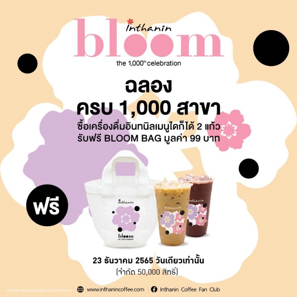 และเพื่อเป็นการฉลอง 1,000 สาขา อินทนิลได้เตรียมกระเป๋าผ้า BLOOM Bag มูลค่า 99 บาท จำนวน 50,000 ใบ สำหรับมอบให้ลูกค้าที่ซื้อเครื่องดื่มอินทนิลเมนูใดก็ได้ 2 แก้ว เฉพาะวันที่ 23 ธันวาคม 2565 ที่ร้านอินทนิลทุกสาขาทั่วประเทศ รายละเอียดเพิ่มเติม ติดตามได้ที่ www.facebook.com/inthanincoffee