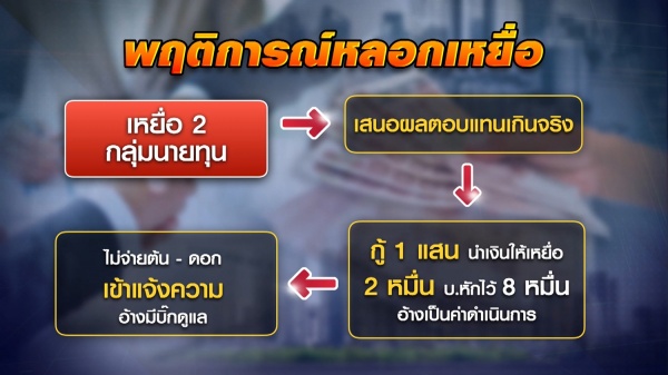 บ๊อบ ณัฐธีร์ : เรื่องนี้มีเหยื่ออยู่ 2 ประเภท มีเพจที่อยู่ในโซเชียล ไปหลอกเหยื่อกลุ่มที่ 1 ที่เป็นหนี้ทั้งบัตรเครดิตและนอกระบบ โดยประเมินแล้วหลอกให้ไปกู้ซื้ออสังหาริมทรัพย์ ให้ได้เงินก้อน ซึ่งจะมีเงินส่วนเกินมาปิดหนี้บัตรหรือหนี้นอกระบบ แล้วทางเพจจะเอาอสังหาไปปล่อยต่อโดยที่เหยื่อไม่ต้องผ่อนเลย แล้วมีคนหลงเชื่อไปปิดหนี้บัตรเครดิต แต่สุดท้ายเป็นหนี้อสังหาริมทรัพย์แทน ส่วนประเภทที่ 2 เป็นเหยื่อกลุ่มนายทุน เขาก็หลอกว่ามีการดำเนินการแบบนี้ ให้นายทุนเอาเงินมาลง โดยเสนอผลตอบแทนเกินจริงคือ 5% ต่อ 10 วัน หากกู้ 1 แสนให้เหยื่อปิดหนี้ โดยเหยื่อกลุ่มที่ 1 จะได้เงิน 2 หมื่น บริษัทเก็บไว้ 8 หมื่น แล้วเอาเงินมาวนจ่ายให้เหยื่อกลุ่มที่ 2 เริ่มจากคุณนกถูกหลอกได้ยังไง?