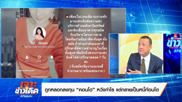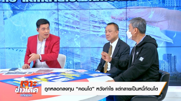 หลงเชื่อคำชักจูง โฆษณาไม่มีที่มา กุศโลบายเย้ายวน ชวนให้โดนหลอก เกิดเป็นคดีล่าสุดสำหรับเหยื่อที่ถูกหลอกลงทุน คอนโด หวังผลกำไรตอบแทนแต่กลายเป็น หนี้ก้อนโต สูญเงินเกือบล้าน ขณะทนายชี้เส้นใหญ่เป็นภัยสังคม แนะกองปราบฯ ดำเนินคดีอาญาคล้ายคดีกลุ่มจีนเทา หลายรายถูกหลอกให้กู้เพื่อปิดหนี้บัตรเครดิต นอกจากไม่ได้ปิดหนี้บัตรเครดิตแล้วยังเป็นหนี้เพิ่ม บางรายถึงขึ้นตรอมใจฆ่าตัวตาย เปิดโต๊ะเคาะประเด็นกันสด ๆ ในรายการ “เจาะข่าวเด็ด สเปเชียล” (The Day News Update Special) โดยผู้ประกาศข่าว “บ๊อบ-ณัฐธีร์ โกศลพิศิษฐ์” งานนี้ยังได้พูดคุยกับ ทนายเกรียงศักดิ์ พินทุสรศรี ที่เข้ามาเปิดเผยขั้นตอนการดำเนินคดีหลังจากนี้ รวมถึงเหยื่อผู้เสียหายทั้งสามท่าน