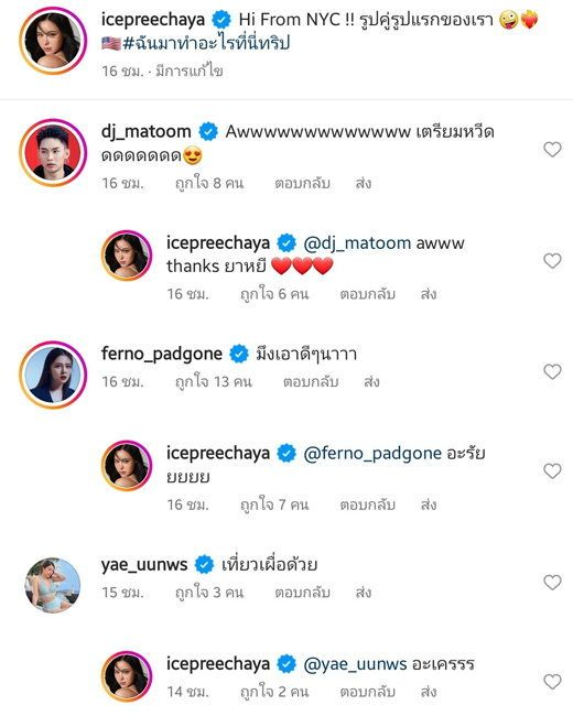 สำหรับนักแสดงสาวสวย อย่าง ไอซ์ ปรีชญา พงษ์ธนานิกร ที่ล่าสุด สาวไอซ์ แชร์โมเมนต์คนคลั่งรักชวนน่าอิจฉาสุด ๆ พร้อมแคปชั่นว่า “Hi From NYC !! รูปคู่รูปแรกของเรา” ทำเอาหลาย ๆ คนในวงการบันเทิงเข้ามาแซวกันเป็นแถว