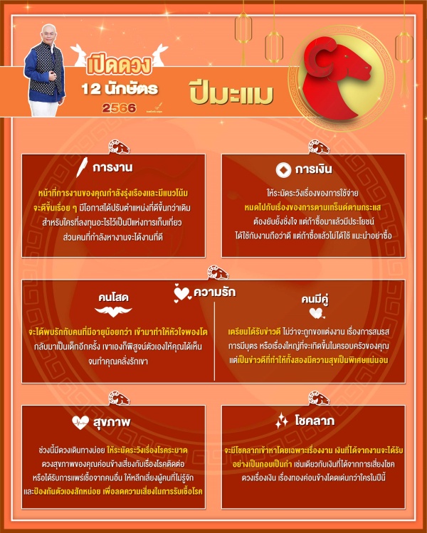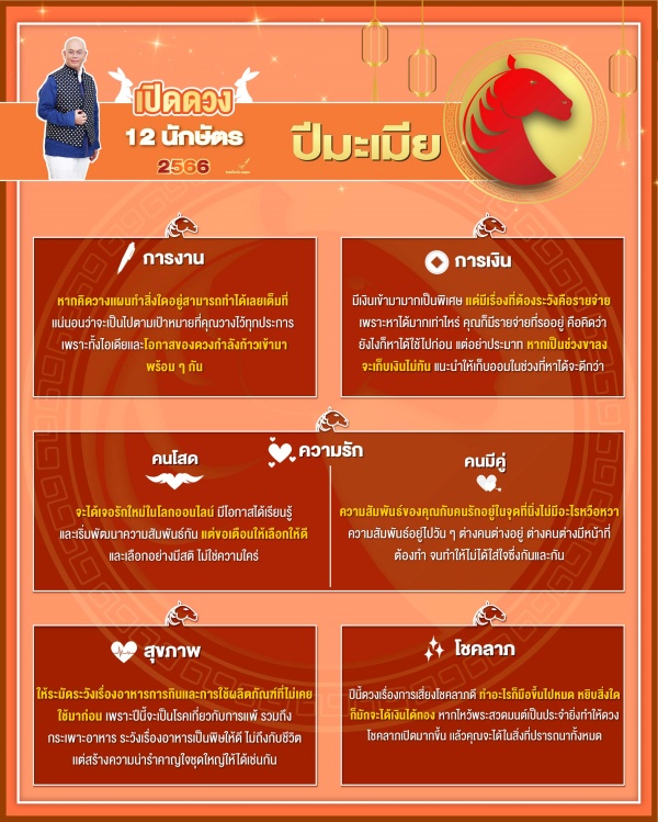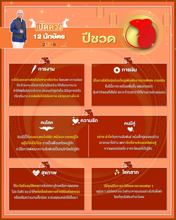 ปีนี้ไม่ห่วงเรื่องสุขภาพกายแต่ต้องระวังเรื่องสุขภาพจิตใจที่เกิดจากสภาพเเวดล้อมจนกลายเป็นความเครียดให้หาเวลาพักผ่อนเปิดโลกใหม่เเละดูเเลตัวเองจะทำให้ชีวิตคุณสดใสขึ้น