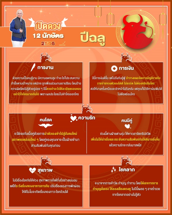 ด้วยความเป็นคนสู้งานมีความอดทนสูงทำอะไรก็ประสบความสำเร็จตามเป้าหมายแต่มักจะถูกเพื่อนร่วมงานเอาเปรียบโดนป้ายความผิดโดยไม่รู้ตัวอยู่บ่อยๆปีนี้ควรทำอะไรให้ละเอียดรอบคอบอย่าไว้ใจใครมากเกินไป เพราะผลประโยชน์ไม่เข้าใครออกใคร