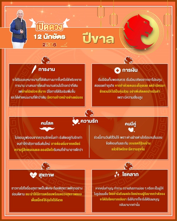 ชาวขาลใส่ใจเรื่องสุขภาพเป็นพิเศษ ถือคติสุขภาพดีทุกอย่างย่อมดีตาม แนะนำให้มีการเตรียมพร้อมตรวจสุขภาพแบบเต็มแม็กให้อุ่นใจไร้กังวล
