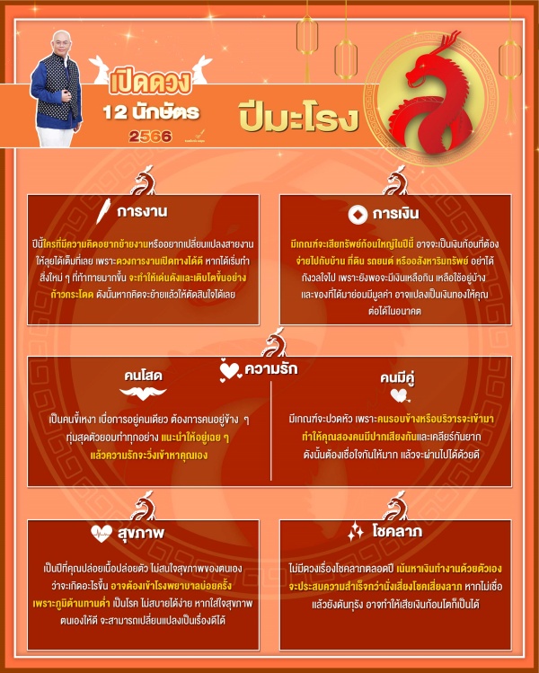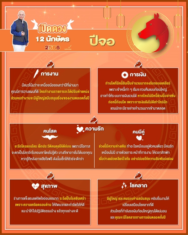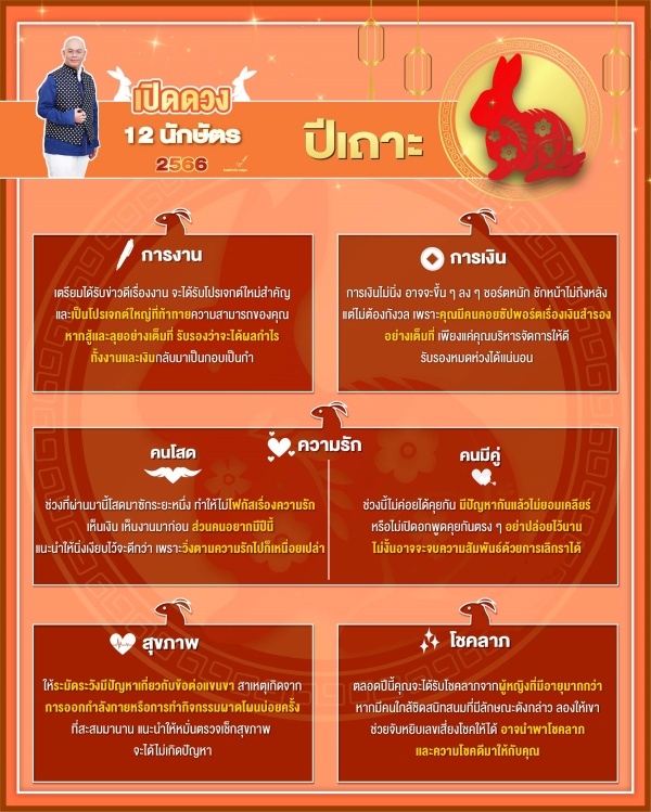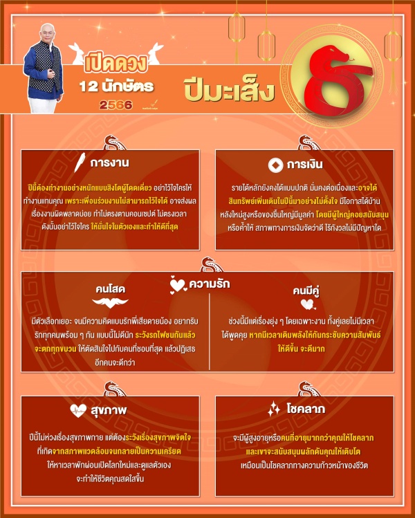 จะมีโชคลาภเข้าหาโดยเฉพาะเรื่องงานเงินที่ได้จากงานจะได้รับอย่างเป็นกอบเป็นกำ เช่นเดียวกับเงินที่ได้จากการเสี่ยงโชคดวงเรื่องเงินเรื่องทองค่อนข้างโดดเด่นกว่าใครในปีนี้