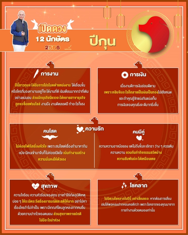 ปีนี้ชาวกุนจะได้รับการโปรโมตตำเเหน่งงาน ได้เลื่อนขั้นหรือใครที่มองหางานอยู่ก็จะได้งานที่ดี เงินเดือนมากกว่าที่เดิมอย่างเเน่นอน ส่วนนักธุรกิจมีเเววจะได้ขยายสาขาธุรกิจถูกขอซื้อเเฟรนไชส์ งานปัง งานดีตลอดปี ทำอะไรก็เฮง