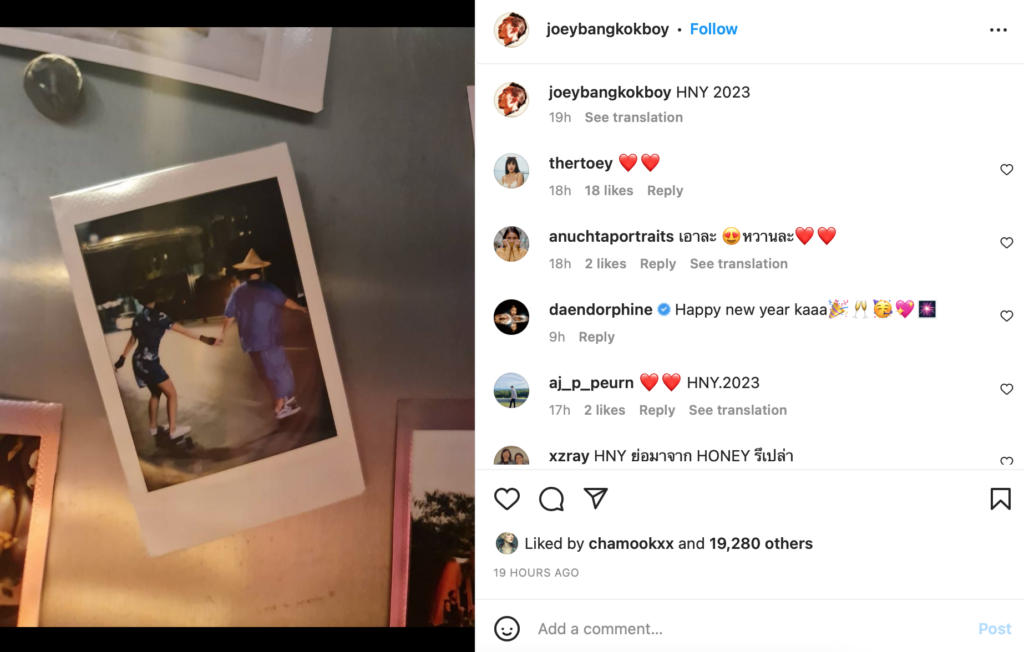 ทำเอาสาวๆอกหักหลังนักร้องแรปเปอร์ชื่อดัง “โจอี้ บอย” อภิสิทธิ์ โอภาสเอี่ยมลิขิต ออกมาลงภาพจับมือกับสาวคนหนึ่งขณะกำลังเล่นสเก็ตบอร์ดด้วยกัน ซึ่งแม้จะเป็นภาพด้านหลังแต่ก็รู้เลยว่าสวีทแค่ไหน โดยเจ้าตัวยังได้ลงแคปชั่นสั้นๆว่า “HNY 2023”