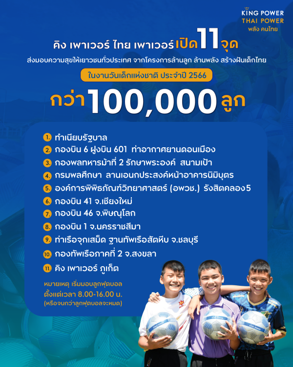 คิง เพาเวอร์ ไทย เพาเวอร์ พลังคนไทย ร่วมกระจายความสุขให้กับเยาวชนไทยทั่วประเทศอีกครั้งเตรียมขนทัพลูกฟุตบอลมาตรฐานระดับสากล!!! กว่า 100,000 ลูก มอบถึงมือน้อง ๆ ในพื้นที่ 11 แห่ง ทั่วประเทศ เป็นของขวัญเนื่องในวันเด็กแห่งชาติประจำปี 2566 เพื่อส่งเสริมให้เด็กไทยมีสุขภาพที่แข็งแรงจากการออกกำลังงกาย นอกจากนี้ยังมีกิจกรรมแข่งขัน Thai Power Challenge เดาะฟุตบอลลุ้นรับของรางวัล อีกด้วย
