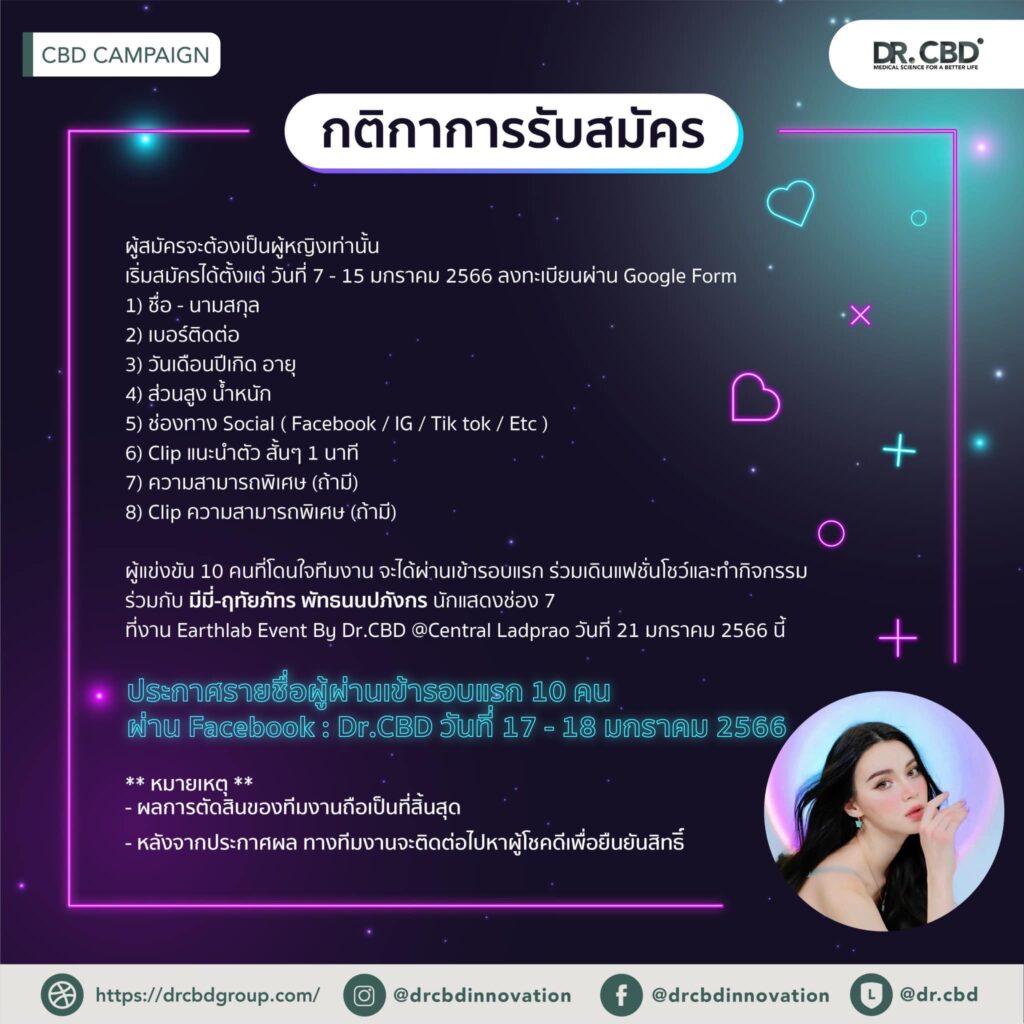 ผู้แข่งขัน 10 คนที่โดนใจทีมงาน จะได้ผ่านเข้ารอบแรก ร่วมเดินแฟชั่นโชว์และทำกิจกรรมร่วมกับ มีมี่-ฤทัยภัทร พัทธนนปภังกร นักแสดงช่อง 7 และ รับของขวัญมูลค่ากว่า 2,500 บาทจาก Dr.CBD ที่งาน EarthlabEvent By Dr.CBD ณ Central Ladprao วันที่ 21 มกราคม 2566 นี้ ประกาศรายชื่อผู้ผ่านเข้ารอบแรก 10 คน ผ่าน Facebook : Dr.CBD วันที่ 17 – 18 มกราคม 2566
