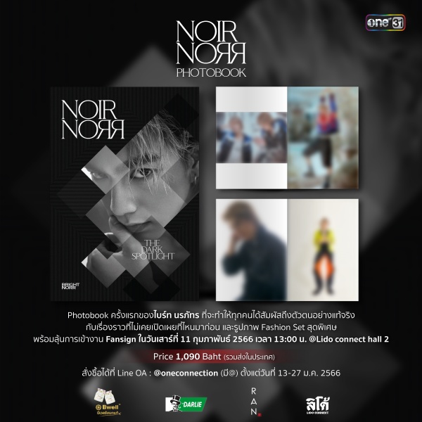 สำหรับแฟน ๆ ของหนุ่มไบร์ท-นรภัทร สามารถสั่งซื้อ (Pre-order) “Noir Norr The Dark Spotlight Photobook” ได้ตั้งแต่วันที่ 13 – 27 ม.ค. นี้เป็นต้นไป ในราคาเล่มละ 1,090 บาท (รวมค่าจัดส่งในประเทศไทย) สั่งซื้อได้ที่ Line OA : @oneconnection (มี @) โดยผู้สั่งซื้อ 300 ท่านแรก จะมีสิทธิ์เข้าร่วมงาน Fan sign (ประกาศผล 2 ก.พ.นี้) ติดตามรายละเอียดได้ที่ Facebook Fanpage : One Connection