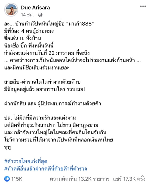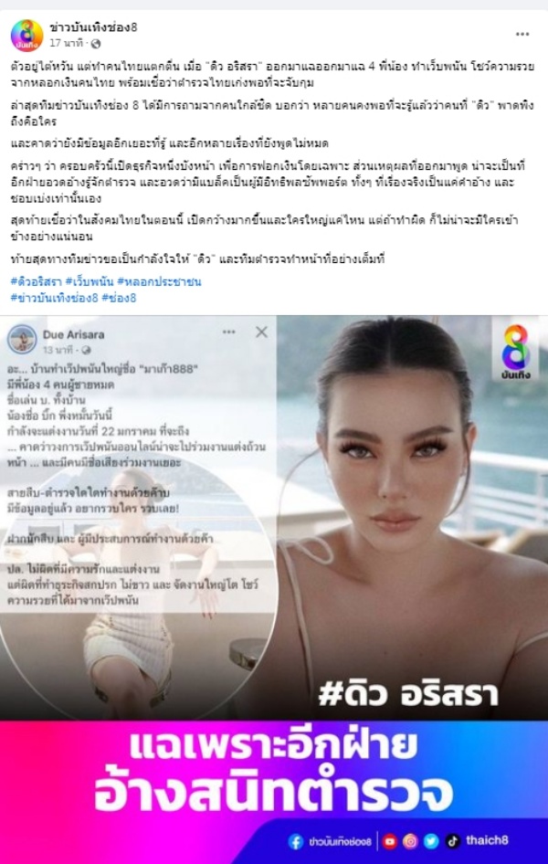 กลายเป็นกระแสข้ามคืน ทำเอาชาวเผือกรอฟังคำตอบกันเพียบ เมื่อ “ดิว อริสรา” ออกมาแฉ 4 พี่น้อง ทำเว็บพนัน โชว์ความรวยจากการหลอกเงินคนไทย พร้อมแนะให้ตำรวจช่วยตรวจสอบ ซึ่งล่าสุดเพจ ข่าวบันเทิงช่อง8 ได้มีการขึ้นโพส ถึงประเด็นดังกล่าว จากปากคนใกล้ชิดสาวดิว เพิ่มเติม
