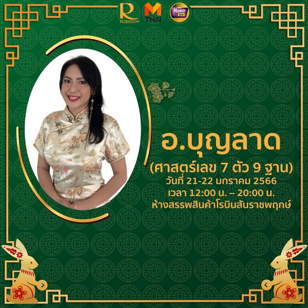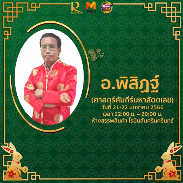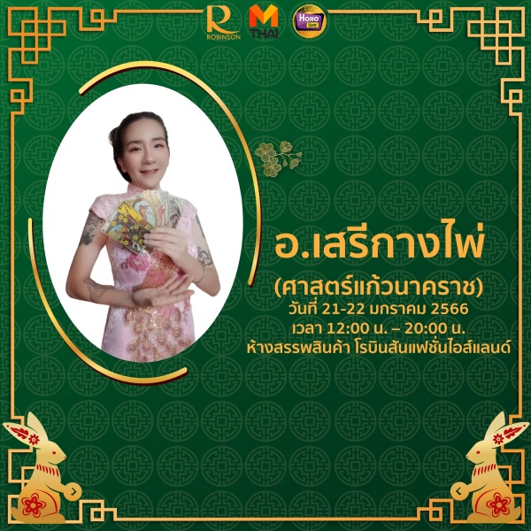 ห้างสรรพสินค้าโรบินสัน พระราม9วิเคราะห์ดวง กับ อ.แน๊ต ,ห้างสรรพสินค้าโรบินสัน ราชพฤกษ์ พบกับ อ.บุญลาด, ห้างสรรพสินค้าโรบินสัน แฟชั่นไอส์แลนด์ พบกับ อ.เสรีกางไพ่ และห้างสรรพสินค้าโรบินสัน ศรีนครินทร์ เช็คดวงกับ อ.พิสิษฐ์ ดูฟรีเพียงโชว์ใบเสร็จ (จำกัด1 ใบเสร็จ/1 สิทธิ์ / 1 คำถาม) ระหว่างวันที่ 21 ม.ค. 66 – 22 ม.ค. 66 เวลา 12.00 -20.00 น. ติดตามรายละเอียดเพิ่มเติม ได้ทาง https://www.facebook.com/Horolivecom