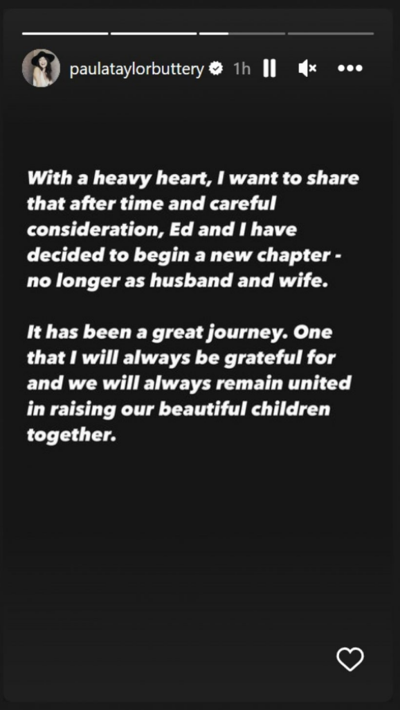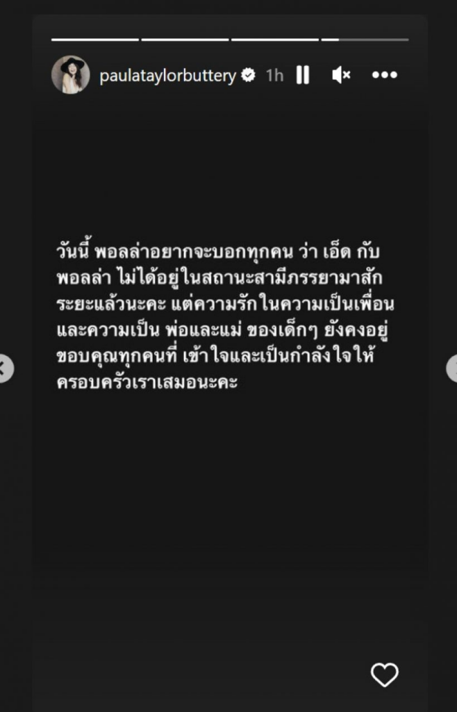 โดย พอลล่า โพสต์ว่า “วันนี้ พอลล่าอยากจะบอกทุกคน ว่า เอ็ด กับ พอลล่า ไม่ได้อยู่ในสถานะสามีภรรยามาสักระยะแล้วนะคะ แต่ความรักในความเป็นเพื่อนและความเป็น พ่อและแม่ ของเด็ก ๆ ยังคงอยู่ขอบคุณทุกคนที่ เข้าใจและเป็นกำลังใจให้ครอบครัวเราเสมอนะคะ”