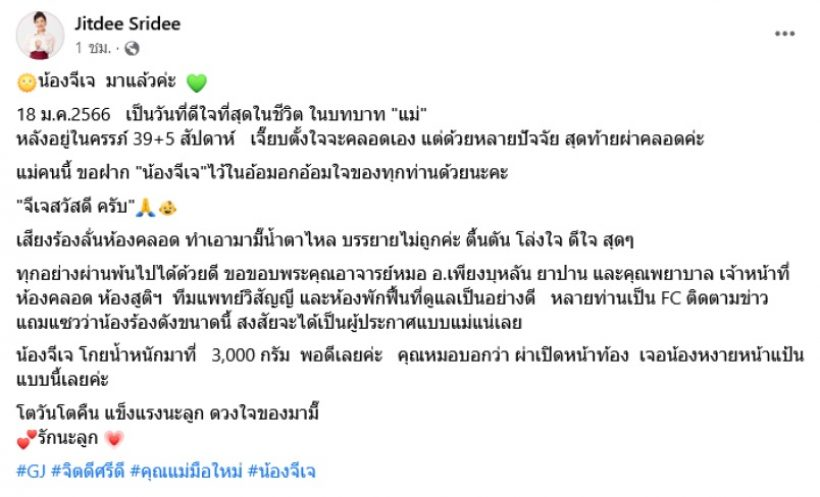 ขอแสดงความยินดีกับ จิตดี ศรีดี ผู้ประกาศข่าวชื่อดัง ที่ล่าสุดคลอดลูกชายคนแรก มีชื่อว่า น้องจีเจ โดย จิตดี โพสต์รูปพร้อมข้อความว่า