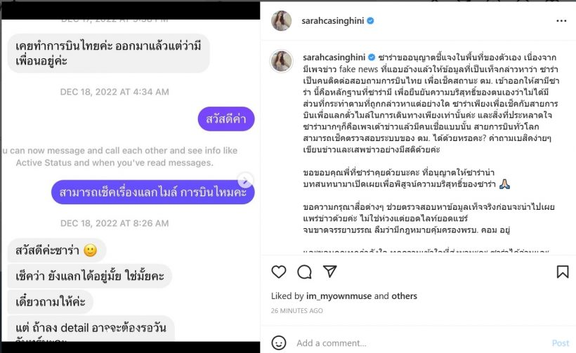 โดย ซาร่า ชี้แจงว่าดังนี้ “ซาร่าขออนุญาตชี้แจงในพื้นที่ของตัวเอง เนื่องจากมีเพจข่าว fake news ที่แอบอ้างแล้วให้ข้อมูลที่เป็นเท็จกล่าวหาว่า ซาร่าเป็นคนติดต่อสอบถามการบินไทย เพื่อเช็คสถานะ ตม. เข้าออกให้สามีซาร่า นี้คือหลักฐานที่ซาร่ามี เพื่อยืนยันความบริสุทธิ์ของตนเองว่าไม่ได้มีส่วนที่กระทำตามที่ถูกกล่าวหาแต่อย่างใด ซาร่าเพียงเพื่อเช็คกับสายการบินเพื่อแลกตั๋วไมล์ในการเดินทางเพียงเท่านั้นค่ะ และสิ่งที่ประหลาดใจซาร่ามากๆก็คือเพจเต้าข่าวแล้วมีคนเชื่อแบบนั้น สายการบินทั่วโลกสามารถเช็คตรวจสอบระบบของ ตม. ได้ด้วยหรอคะ? คำถามเบสิคง่ายๆ เขียนข่าวและเสพข่าวอย่างมีสติด้วยค่ะ