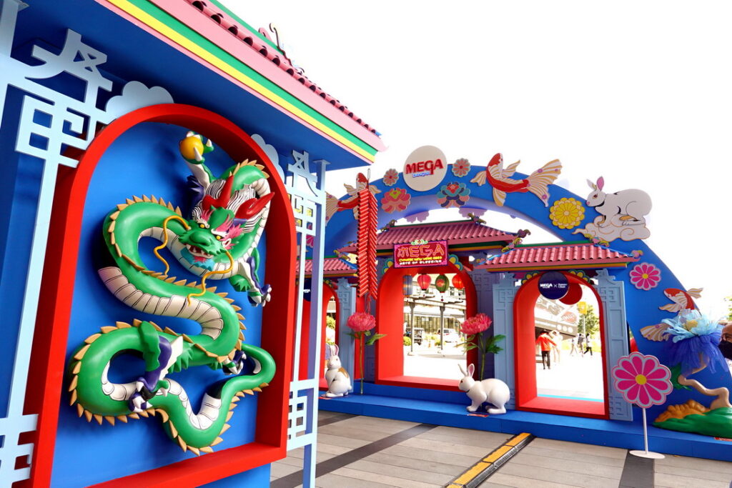 ความโดดเด่นของงาน MEGA CHINESE NEW YEAR 2023 ครั้งนี้ คือ จุดแลนด์มาร์ค บริเวณทางเข้าหลัก ที่จัดทำเป็น Installation Art จากผลงานการออกแบบของ คุณปอม ชาน ที่ตกแต่งสุดตระการตา เอาใจชาวโซเชียล สำหรับเช็คอินถ่ายภาพและได้แชร์กันอย่างเต็มที่ รวมถึงกิจกรรมเพื่อความเป็นสิริมงคล ได้แก่ บูชาเทพเพื่อความเป็นสิริมงคล พระโพธิสัตว์กวนอิม ปางเมตตา ประทานพร บูชาเพื่อความปลอดภัยจากดวงชะตา และ ปราศจากโรคภัย และมีโชคลาภ อัญเชิญมาจากพุทธสถานนครปักกิ่ง ประเทศจีน เทพเจ้าไฉ่ซิงเอี้ย เทพแห่งโชคลาภ(ขอพรด้านธุรกิจทรัพย์สินเงินทอง ) อัญเชิญจากเมืองฮกเกี้ยน ประเทศจีน องค์พระแม่กิมบ้อเนี้ย พระแม่อายุยืน (ครอบครัวแข็งแรงอายุมั่นขวัญยืน) อัญเชิญจากเมืองฮกเกี้ยน ประเทศจีน โดยรูปเคารพองค์เทพทั้งสามองค์นี้ ได้รับการอัญเชิญโดยวิหารพุทธานุสรณ์ หน่วยเผยแพร่ศีลธรรม กรมการศาสนา กระทรวงวัฒนธรรม อ.บ้านโป่ง จ.ราชบุรี และ กิจกรรมเสี่ยงเซียมซีมหามงคล เพื่อตอบโจทย์ครบทุกไลฟ์สไตล์ของลูกค้าเมกาบางนาตลอดช่วงเทศกาลตรุษจีนนี้