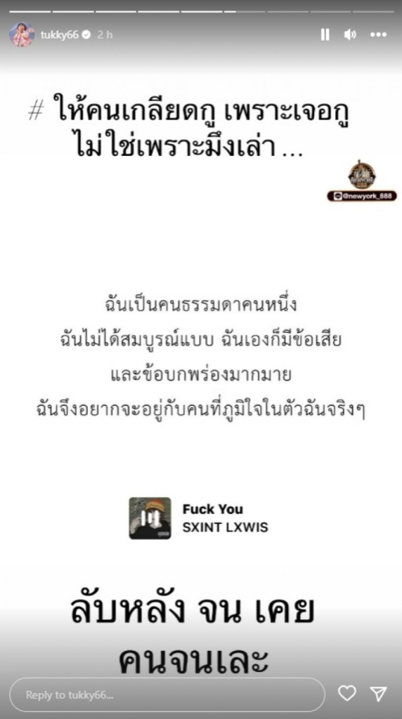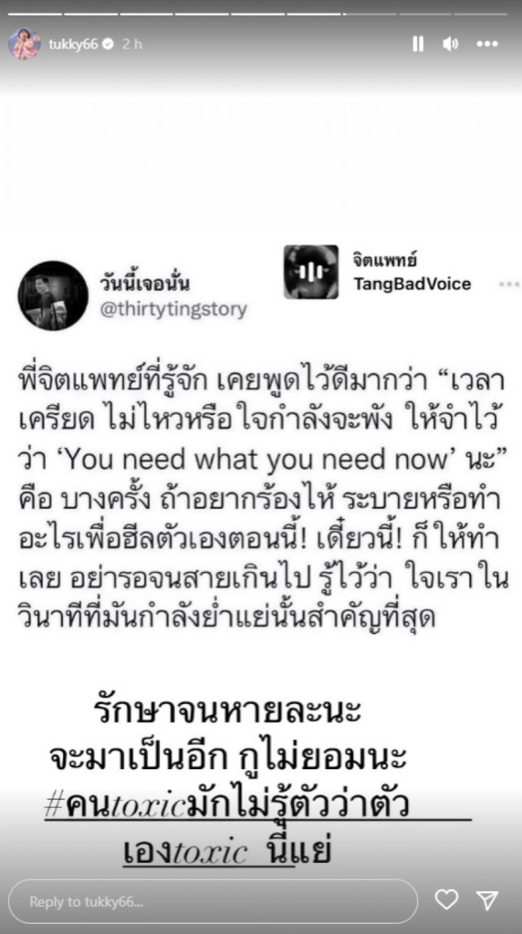 แต่ล่าสุด ไม่รู้ว่าเกิดอะไรขึ้น เพราะ ตุ๊กกี้ โพสต์ข้อความสุดเดือดผ่านสตอรี่ โดยมีข้อความว่า ‘ฉันเป็นคนธรรมดาคนหนึ่งฉันไม่ได้สมบูรณ์แบบ ฉันเองมีข้อเสียและข้อบกพร่องมากมาย ฉันจึงอยากอยู่กับคนที่ภูมิใจในตัวฉันจริง ๆ’ และแสดงความคิดเห็นเพิ่มเติมว่า ‘#ให้คนเกลียดกูเพราะเจอกูไม่ใช่เพราะมึงเล่า… , ลับหลัง จน เคยคนจนเละ’ และอีกหนึ่งข้อความว่า ‘พี่จิตแพทย์ที่รู้จักเคยพูดไว้ดีมาก เวลาเครียดไม่ไหวหรือใจกำลังพัง ให้จำไว้ว่า You need what you need now นะ คือบางครั้งถ้าอยากร้องไห้ระบายหรือทำอะไรเพื่อฮีลตัวเองตอนนี้ เดี๋ยวนี้ ก็ให้ทำเลย อย่ารอจนสายเกินไป รู้ไว้ว่า ใจเราวินาทีที่มันกำลังย่ำแย่นั้นสำคัญที่สุด’ และแสดงความคิดเห็นเพิ่มเติมว่า ‘รักษาจนหายละนะจะมาเป็นอีกกูไม่ยอมนะ #คนtoxicมันไม่รู้ตัวว่าตัวเองtoxicนี่แย่’ ส่วนเรื่องราวจะเป็นยังไงต้องรอเจ้าตัวมาอธิบายเพิ่มเติมนะคะ