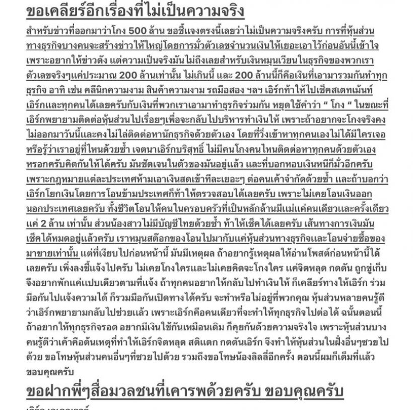 ล่าสุด เอิร์ก เลเดอเรอร์ เคลื่อนไหวอีกครั้ง โดยมีรายละเอียดว่า “ขอเคลียร์อีกเรื่องที่ไม่เป็นความจริง สำหรับข่าวที่ออกมาว่า โกง 500 ล้าน ขอชี้แจงตรงนี้เลย ว่าไม่เป็นความจริงครับ การที่หุ้นส่วนทางธุรกิจบางคน จะสร้างข่าวให้ใหญ่ โดยการมั่วตัวเลขจำนวนเงินให้เยอะเอาไว้ก่อน อันนี้เข้าใจ เพราะอยากให้ข่าวดัง แต่ความเป็นจริงมันไม่ถึงเลย สำหรับเงินหมุนเวียนในธุรกิจของพวกเรา ตัวเลขจริงๆ แค่ประมาณ 200 ล้านเท่านั้น ไม่เกินนี้ และ 200 ล้าน นี้ก็คือเงินที่เอามารวมกันทำทุกธุรกิจ อาทิ เช่น คลีนิกความงาม สินค้าความงาม รถมือสอง ฯลฯ