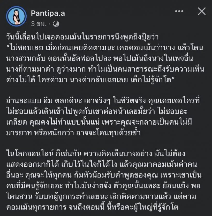 สำหรับคุณแม่สายแซ่บ อย่าง ปุ้มปุ้ย พรรณทิพา ที่ไม่ว่าจะมีเหตุการณ์ไหนเจ้าตัวก็จะโดนแซะอยู่ประจำ จนล่าสุด แม่ไม่ไหวแล้วค่าาาาาาแม่เลยตอกกลับชาวเน็ตที่เคยคอมเมนต์ต่อว่า โดยโพสต์นี้บอกว่า “วันนี้เลื่อนไปเจอคอมเมนต์ในรายการนึงพูดถึงปุ้ยว่า ‘ไม่ชอบเลย เมื่อก่อนเคยติดตามนะ เคยคอมเมนต์ว่านาง แล้วโดนนางสวนกลับ ตอนนั้นอันฟอลไปละ พอไปเมนต์ถึงนางในเพจอื่น นางก็ตามมาด่า ดูว่างมาก ทำไมเป็นคนสาธารณะถึงรับความเห็นต่างไม่ได้ ใครด่ามา นางด่ากลับเฉยเลย เด็กไม่รู้จักโต” บอกแล้วว่าอย่ามาเล่นกับตัวแม่นะคะ อิอิ