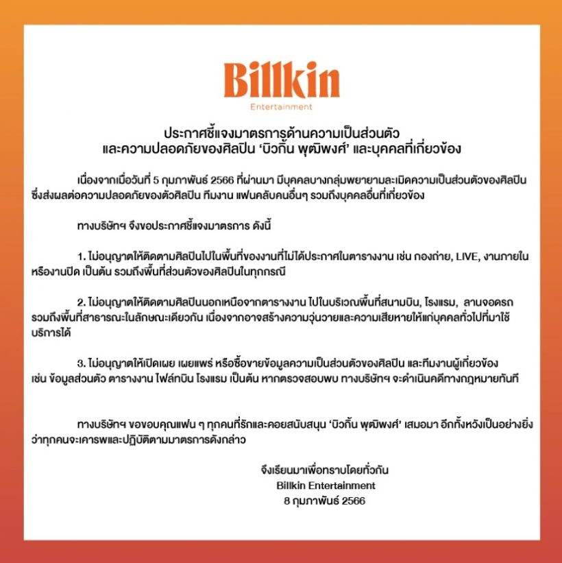 ต้นสังกัด “Billkin Entertainment” ประกาศมาตรการด่วน!! เพื่อสร้างความส่วนตัวและความปลอดภัยของศิลปิน อย่าง “บิวกิ้น พุฒิพงศ์” นั่นเอง