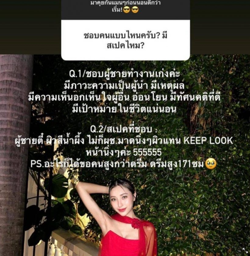 ล่าสุด สาวดรีม ตอบคำถามแบบตรงไปตรงมา เมื่อมีชาวเน็ตท่านหนึ่งถามถึงสเปคหนุ่ม โดย สาวดรีม บอกว่า “1. ชอบผู้ชายซทำงานเก่งค่ะ มีภาวะความเป็นผู้นำ มีเหตุผล มีความเห็นอกเห็นใจผู้อื่น อ่อนโยน มีทัศนคติที่ดี มีเป้าหมายในชีวิตแน่นอน 2.สเปคที่ชอบ ผู้ชายตี๋ ผิวสีน้ำผึ้ง ไม่ก็ผช.มาดนิ่ง ๆ ผิวแทน KEEP LOOK หน้านิ่ง ๆ ค่ะ 55555 PS.อะไรก็ได้ขอแค่สูงกว่าดรีม ดรีมสูง 171 ซม”