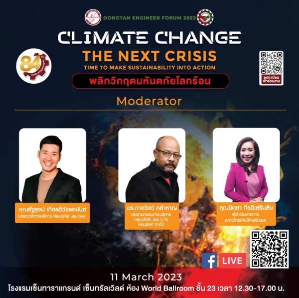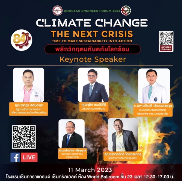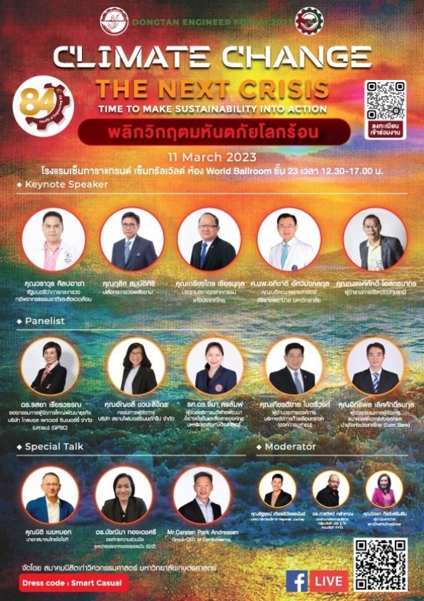 Dongtan Engineer Forum 2023 สมาคมนิสิตเก่าวิศวกรรมศาสตร์ มหาวิทยาลัยเกษตรศาสตร์ Climate Change : The Next Crisis Time to make sustainability into action “พลิกวิกฤตมหันตภัยโลกร้อน” วันเสาร์ที่ 11 มีนาคม 2566 เวลา 12:30-17:00 น. โรงแรมเซ็นทาราแกรนด์แอทเซ็นทรัลเวิลด์ ห้องเวิลด์บอลรูมชั้น 23