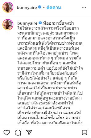 นอกจากนี้ยังเขียนแคปชั่นอีกว่า “ที่ออกมาชี้แจงช้า ไม่ใช่เพราะกลัวความจริงหรืออยากจะหลบนักข่าวเลยค่ะ บอกตามตรงว่าที่ออกมาชี้แจงช้าส่วนหนึ่งเป็นเพราะตัวแอร์เพิ่งได้ทราบข่าวทั้งหมด และอีกส่วนหนึ่งก็เป็นเพราะแอร์เองหลังจากที่ได้ใช้เวลาอ่านข่าว โพส และคอมเมนท์ต่างๆ ทั้งหมด รวมถึงได้ลองปรึกษากับเพื่อน ๆ และทีมทนายความแล้ว แอร์เองก็ยังไม่เข้าใจว่ามีส่วนไหนที่มาเกี่ยวข้องกับแอร์หรือไอซ์ได้อย่างไร แต่อยู่ๆ ก็เกิดการคาดเดาและพาดพิงมาที่แอร์หรือเอารูปแอร์ไปเป็นภาพประกอบข่าวเสียจนทำให้เกิดความเข้าใจผิดกันไปใหญ่โต แถมสื่อมวลชนบางรายยังนำเสนอข่าวในเชิงชี้นำสังคมทำให้เข้าใจได้ว่าแอร์และไอซ์มีส่วนเกี่ยวข้องกับกรณีดังกล่าว และก่อให้เกิดความเสื่อมเสียชื่อเสียง ความน่าเชื่อถือ ทั้งในวงการบันเทิงและในเชิงธุรกิจ ทั้งกับตัวแอร์และไอซ์รวมไปถึงธุรกิจของครอบครัว”