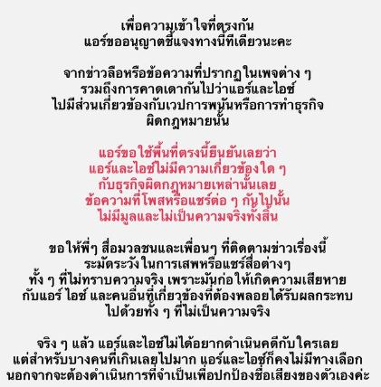 “เพื่อความเข้าใจที่ตรงกัน แอร์ขออนุญาตชี้แจงทางนี้ทีเดียวนะคะ จากข่าวลือหรือข้อความที่ปรากฎในเพจต่างๆ รวมถึงการคาดเดากันไปว่าแอร์และไอซ์ไปมีส่วนเกี่ยวข้องกับเวปการพนันหรือการทำธุรกิจผิดกฎหมายนั้น แอร์ขอใช้พื้นที่ตรงนี้ยืนยันเลยว่า แอร์และไอซ์ไม่มีความเกี่ยวข้องใดๆกับธุรกิจผิดกฎหมายเหล่านั้นเลย ข้อความที่โพสหรือแชร์ต่อๆ กันไปนั้นไม่มีมูลและไม่เป็นความจริงทั้งสิ้น