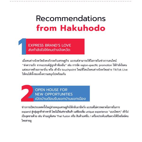 หลังจบ High season ช่วงปีใหม่ ทำให้คนต่างจังหวัดเกิดความกังวลกับเรื่องเศรษฐกิจ แนะให้แบรนด์ใช้โอกาสนี้ ‘ส่งความรัก จากแบรนด์ สู่ลูกค้าท้องถิ่น’ ในช่วงวาเลนไทน์ โดยใช้การจัดโปรโมชันเพื่อตอบโจทย์คนในแต่ละภูมิภาคด้วยภาษาถิ่น เพื่อให้เกิดความประทับใจใหม่ผ่านแพลตฟอร์มที่โดนใจคนต่างจังหวัด เช่น ส่งเสริมการขายใน Tiktok Live ให้ผู้ชมเข้าถึงได้ง่าย ได้ทั้งความสนุกและสินค้าไปพร้อมกัน