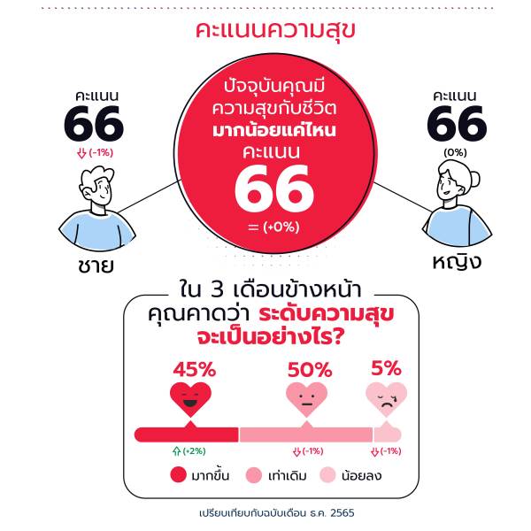 - คนไทยยังสุขคงที่ และมองบวกอย่างมีความหวัง พร้อมต้องการให้เกิดการเปลี่ยนแปลงในสังคมให้ดีขึ้นในทุกมิติ