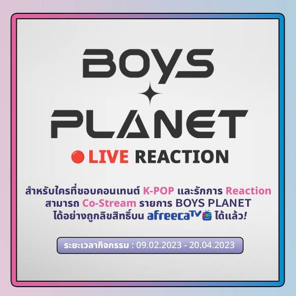 ส่วนใครเป็นสายคอนเท็นต์ที่สนใจการทำ Live Reaction หรือสร้างสรรค์คอนเทนต์สุดครีเอทีฟ โอกาสในการเป็นดาวมาถึงแล้ว! เมื่อ AfreecaTV เปิดโอกาสให้ผู้ใช้งานสามารถทำคอนเท็นต์ Watch Party พร้อมกับการถ่ายทอดสดรายการ BOYS PLANET ในแพลต์ฟอร์ม AfreecaTV ได้อย่างถูกลิขสิทธิ์ นอกจากจะได้ปล่อยพลังแสดงฝีมือแล้วยังได้ลุ้นดรอปของรางวัลสุดพิเศษเฉพาะการถ่ายทอดสดนี้เท่านั้นอีกด้วย!