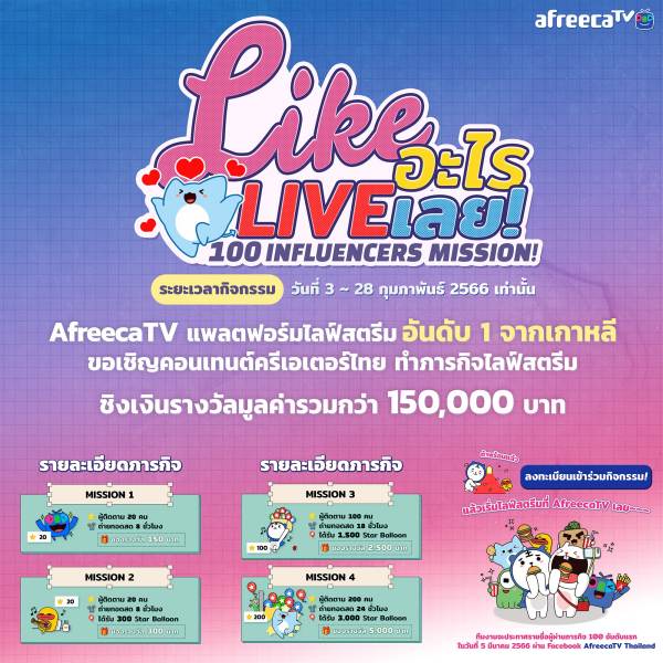 นอกจากนี้ AfreecaTV ยังสนับสนุนสายไลฟ์สไตล์ ด้วยภารกิจไลฟ์สตรีมสุดพิเศษประจำเดือน ‘Like อะไร Live เลย!’ เพียงเริ่มไลฟ์สตรีมที่ AfreecaTV และทำภารกิจสุดท้าทายสำเร็จ ก็สามารถรับเงินสนับสนุนเพื่อพัฒนาคอนเทนต์ที่น่าสนใจได้อีกด้วย รายละเอียดกิจกรรม: https://bj.afreecatv.com/aftvthai/post/97849534