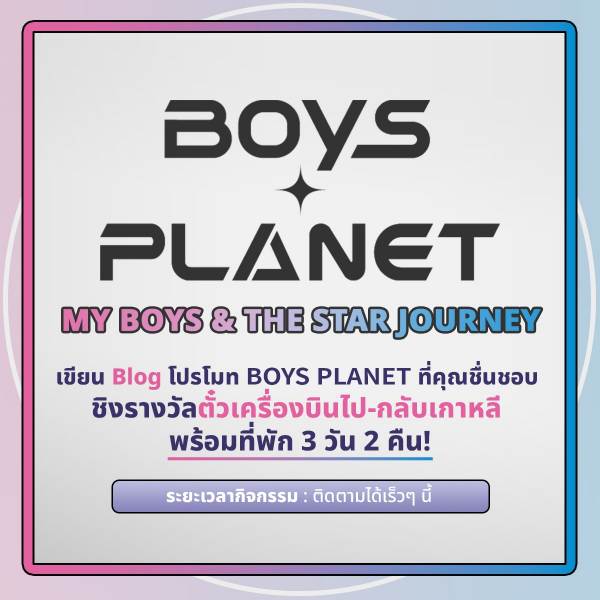 ยังไม่หมดเพียงเท่านี้! ยังมีอีก 1 กิจกรรมที่น่าสนใจจาก AfreecaTV นั่นคือ กิจกรรม MY BOYS & STAR JOURNEY ซึ่งเปิดโอกาสให้แฟนคลับของหนุ่ม ๆ BOYS PLANET ได้แสดงความชื่นชอบผ่านทาง Blog ของ AfreecaTV เพียงแค่ร่วมโพสต์เรื่องราวดี ๆ และความประทับใจที่มีเกี่ยวกับรายการ BOYS PLANET เพียงเท่านี้ก็มีสิทธิ์ลุ้นรางวัลใหญ่เป็นตั๋วเครื่องบินไป – กลับ เกาหลี พร้อมที่พัก 3 วัน 2 คืน!
