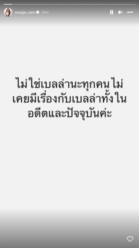 แต่!!! ล่าสุด สาวมาร์กี้ ออกมาโพสต์ข้อความเคลียชัดผ่านทางสตอรี่ไอจี โดยเผยว่า “ไม่ใช่เบลล่านะทุกคน ไม่เคยมีเรื่องกับเบลล่าทั้งในอดีตและปัจจุบันค่ะ”