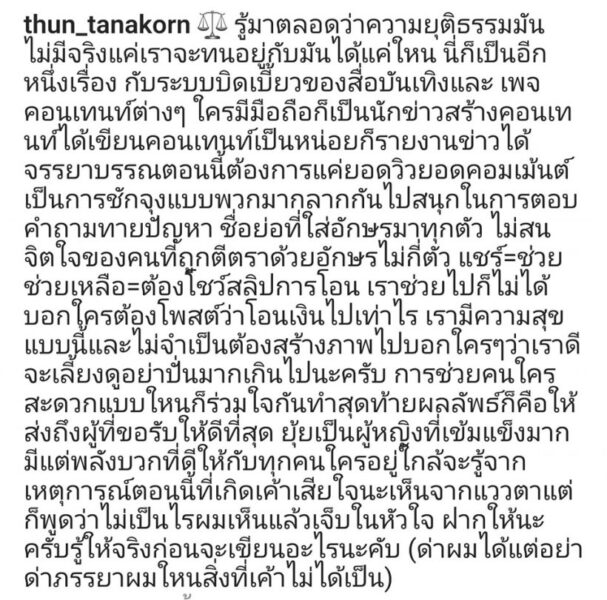 ส่วนทาง ธันน์ ธนากร ที่ทนอยู่เฉยไม่ไหวก็ออกมาโพสต์ปกป้องภรรยาว่า “รู้มาตลอดว่าความยุติธรรมมันไม่มีจริงแค่เราจะทนอยู่กับมันได้แค่ใหน นี่ก็เป็นอีกหนึ่งเรื่อง กับระบบบิดเบี้ยวของสื่อบันเทิงและ เพจคอนเทนท์ต่าง ๆ ใครมีมือถือก็เป็นนักข่าวสร้างคอนเทนท์ได้เขียนคอนเทนท์เป็นหน่อยก็รายงานข่าวได้ จรรยาบรรณตอนนี้ต้องการแค่ยอดวิวยอดคอมเม้นต์ เป็นการชักจุงแบบพวกมากลากกันไปสนุกในการตอบคำถามทายปัญหา ชื่อย่อที่ใส่อักษรมาทุกตัว ไม่สนจิตใจของคนที่ถูกตีตราด้วยอักษรไม่กี่ตัว แชร์=ช่วย ช่วยเหลือ=ต้องโชว์สลิปการโอน