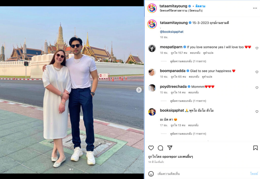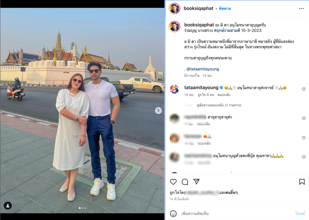 โดยเมื่อวาน สาวทาทา ยัง และ หนุ่มบุ๊ค พร้อมใจกันโพสต์รูปคู่ที่หน้าวัดพระแก้ว พร้อมแคปชั่นชวนสงสัยว่า “15-3-2023 ฤกษ์งามยามดี . @booksiqaphat”